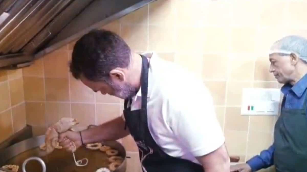 The Congress leader then tries his hand at making ‘imarti’ and ‘besan laddoo’.