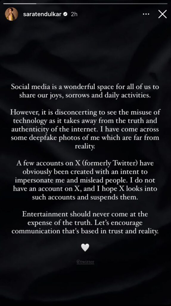Sara Tendulkar said that some accounts on social media platform X are impersonating her to mislead people and entertainment journalists. She said that she is concerned by misuse of technology. Taking to Instagram she wrote, ”Social media is a wonderful space for all of us to share our joys, sorrows and daily activities. However, it is disconcerting to see the misuse of technology as it takes away from the truth and authenticity of the internet. I have come across some deepfake photos of me which are far from reality”.