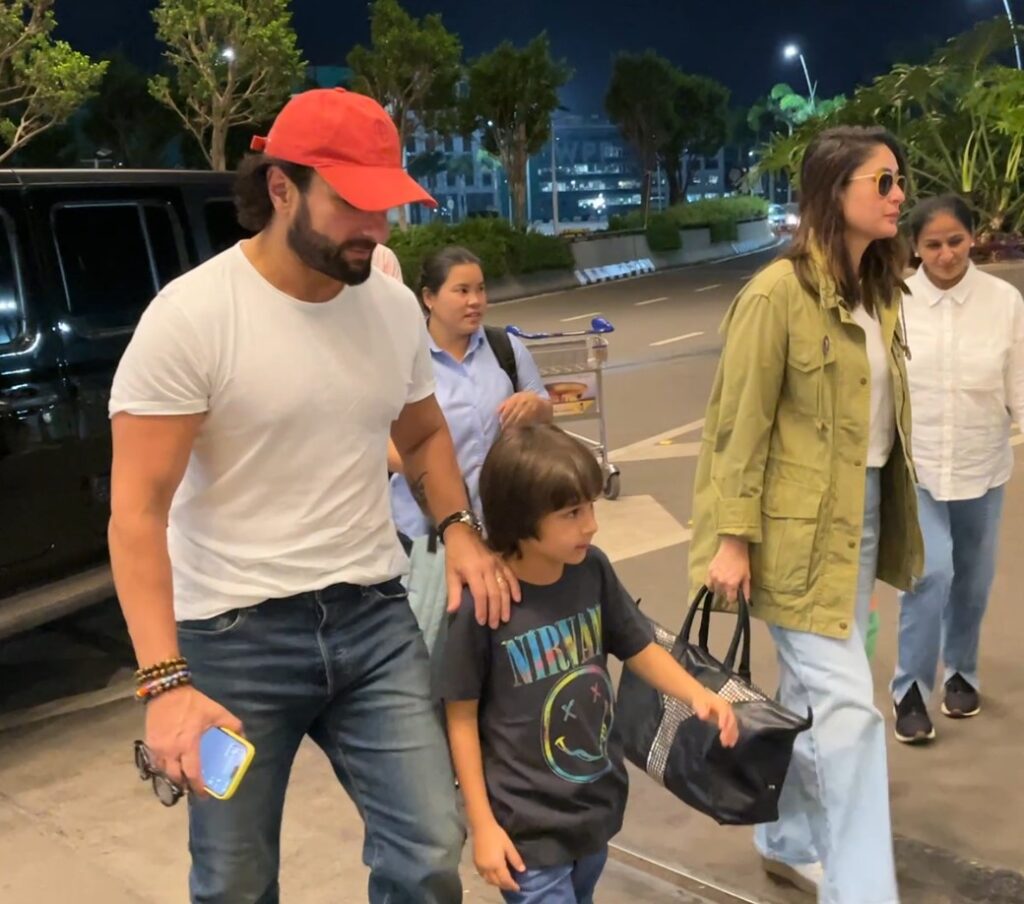 Entering the airport, Kareena was seen holding Jeh’s hand, while Taimur and Saif were seen walking in front. Saif also greeted and waved at the paps.