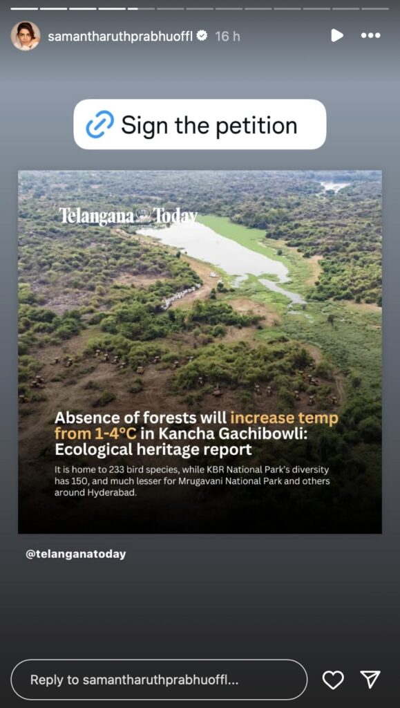 Actress Samantha Ruth Prabhu posted on Instagram about this issue. She shared a report that says cutting down the trees could raise the temperature in Hyderabad by 1 to 4 degrees Celsius.