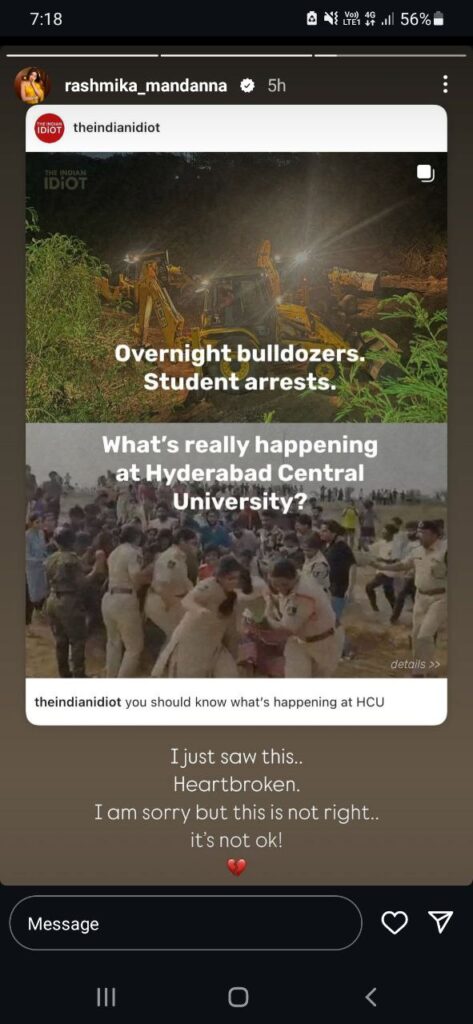 Bollywood actress Dia Mirza, who is also from Hyderabad, shared her support on X. She wrote, “Students are raising their voices for a future where nature thrives. Forests, not IT parks, offer young people a chance at a sustainable tomorrow. ‘Development’ at the cost of biodiversity is DESTRUCTION. Save Kancha Forest in Gachibowli, Hyderabad.”