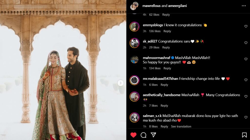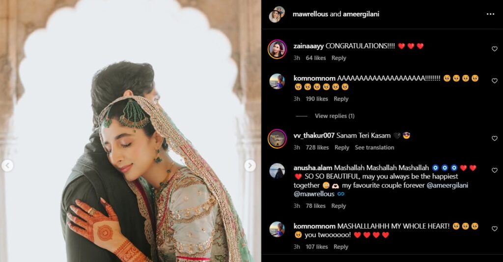 Yumna Zaidi wrote, “MashAllah @mawrellous @ameergilani Big Big congratulations, may you two shine bright together forever, Ameen.”