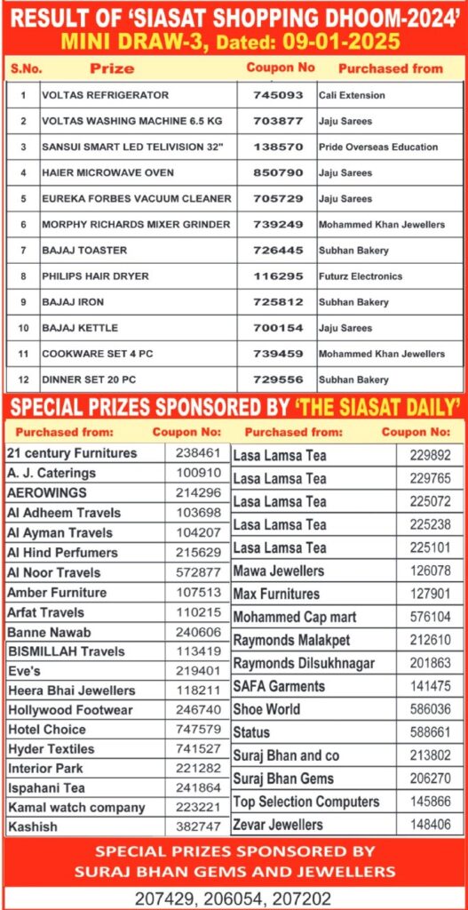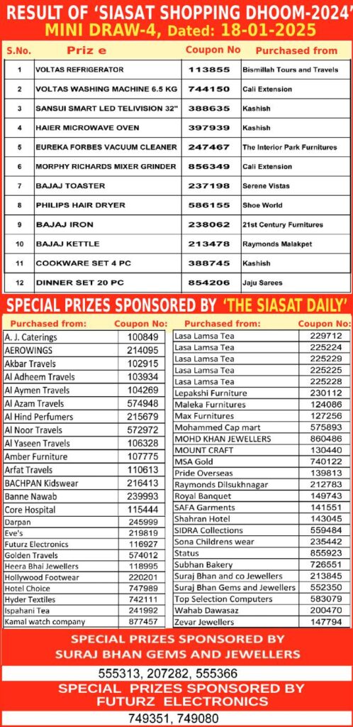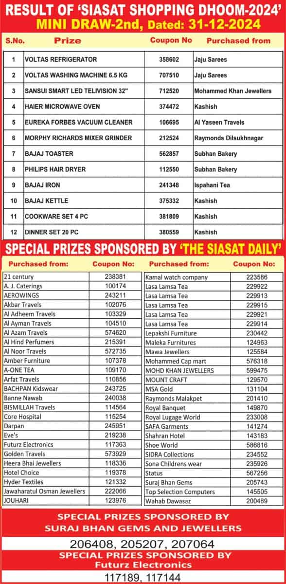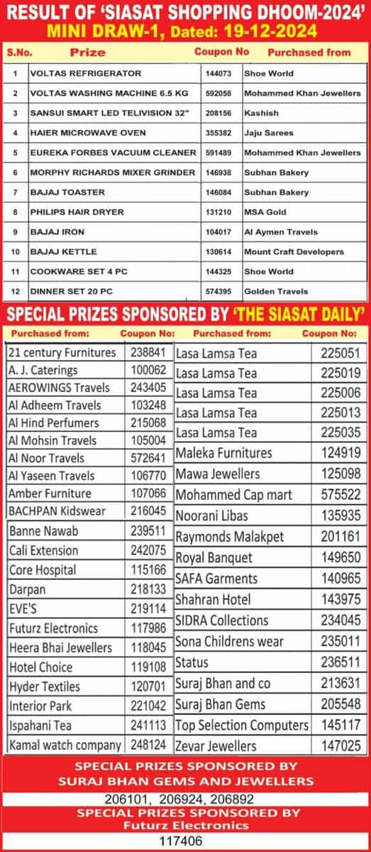 - The participating outlets are wholly responsible for handing over the SIASAT SHOPPING DHOOM Contest Coupons to THE SIASAT DAILY before 8:00 pm one day prior to every draw date.