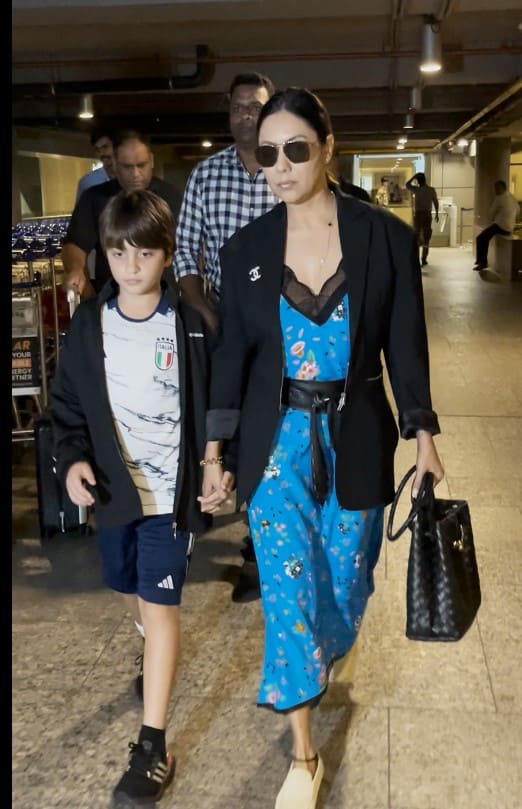 Gauri wore a printed blue floral dress that she topped up with a black blazer. She completed her look with a black handbag and pair of sunglasses while her son looked cute in his casual outfit.