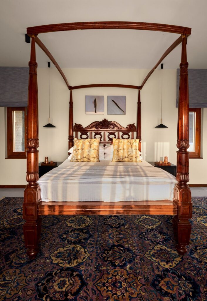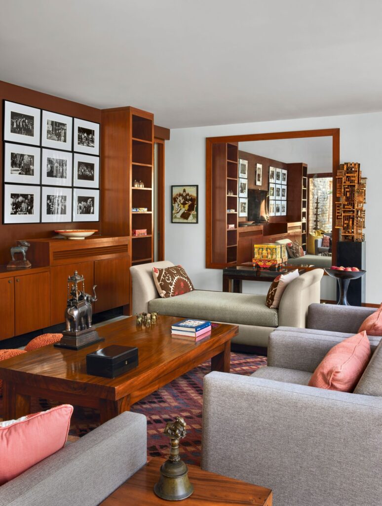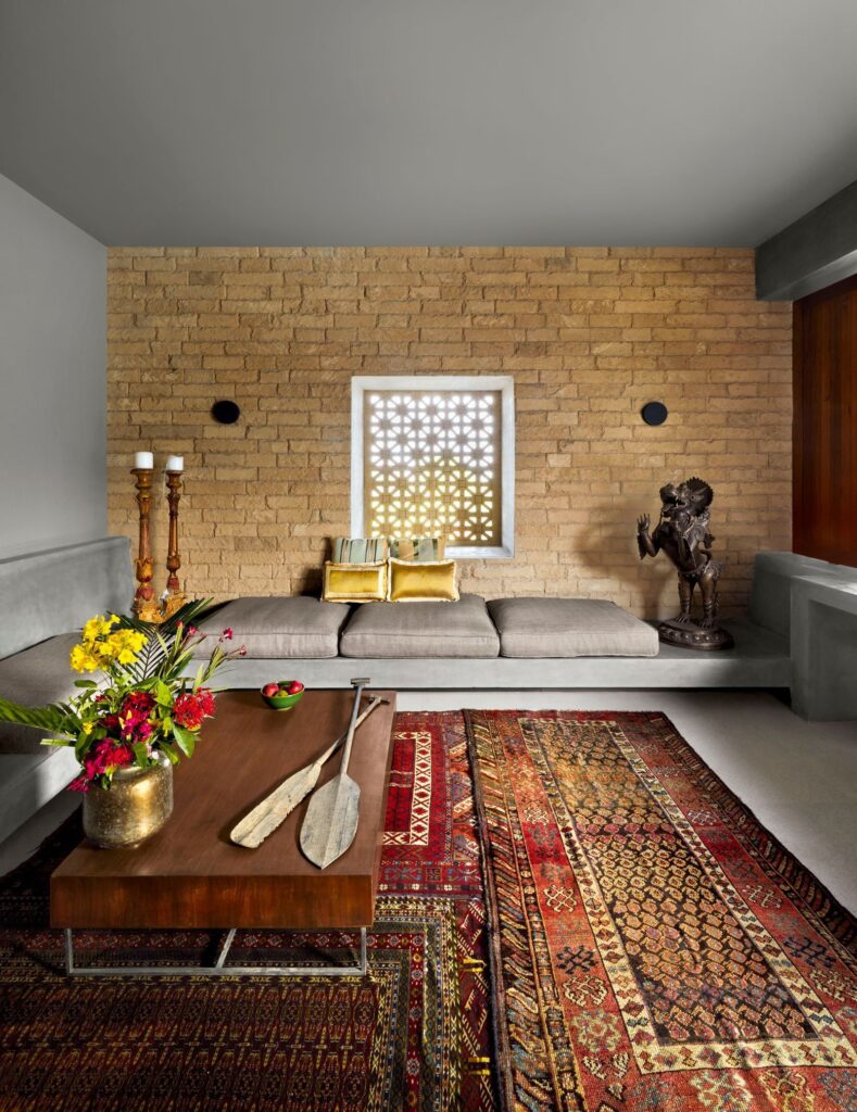 Jay Mehta worked with famous architect Channa Daswatte to improve the home. They added beautiful carpets, teak wood furniture, and unique art. One special area is the dining room, which has a painted ceiling that looks like a sky full of clouds.