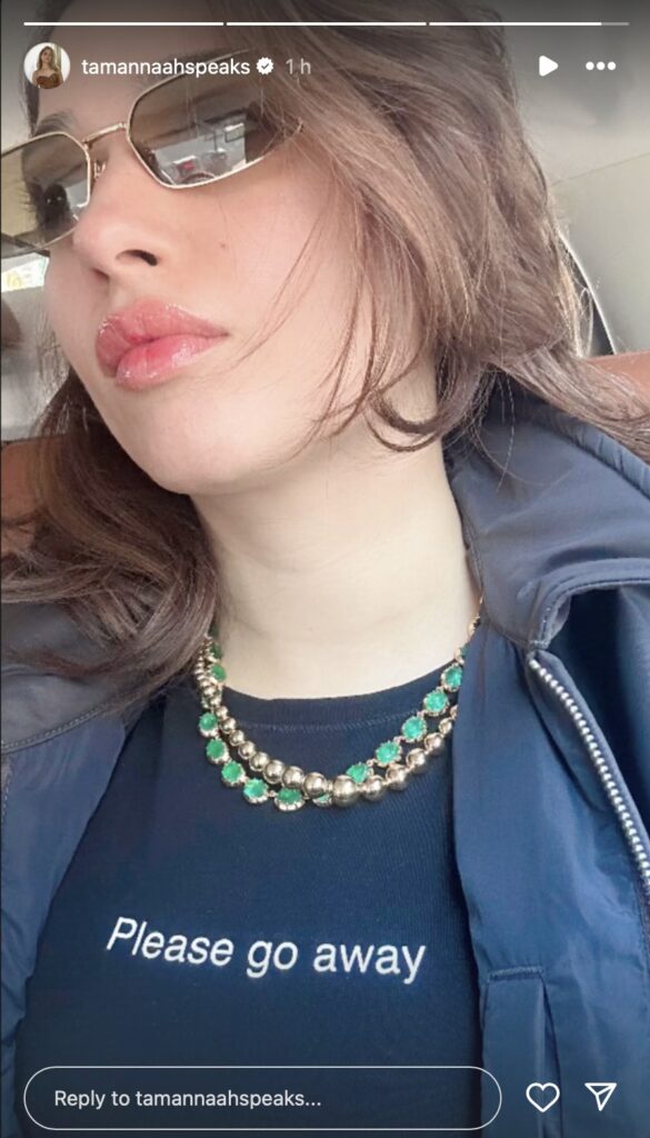 Tamannaah took to her Instagram stories section, where she shared a selfie, where she is seen making a slightly frowning face. The focus is on the T-shirt she is wearing which has “Please Go Away” written on it.