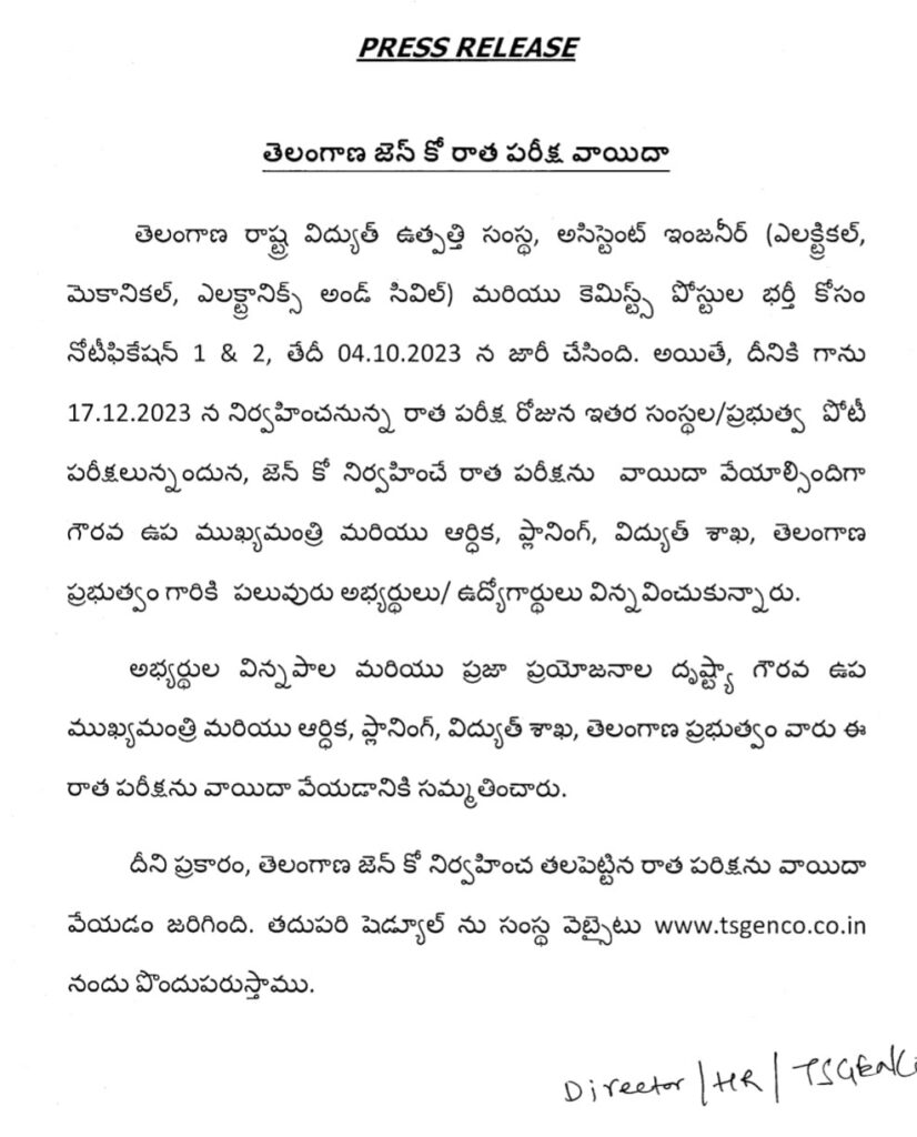 A press release issued by the director of TSGENCO said that the updated date of the exam will be announced soon on its website.
