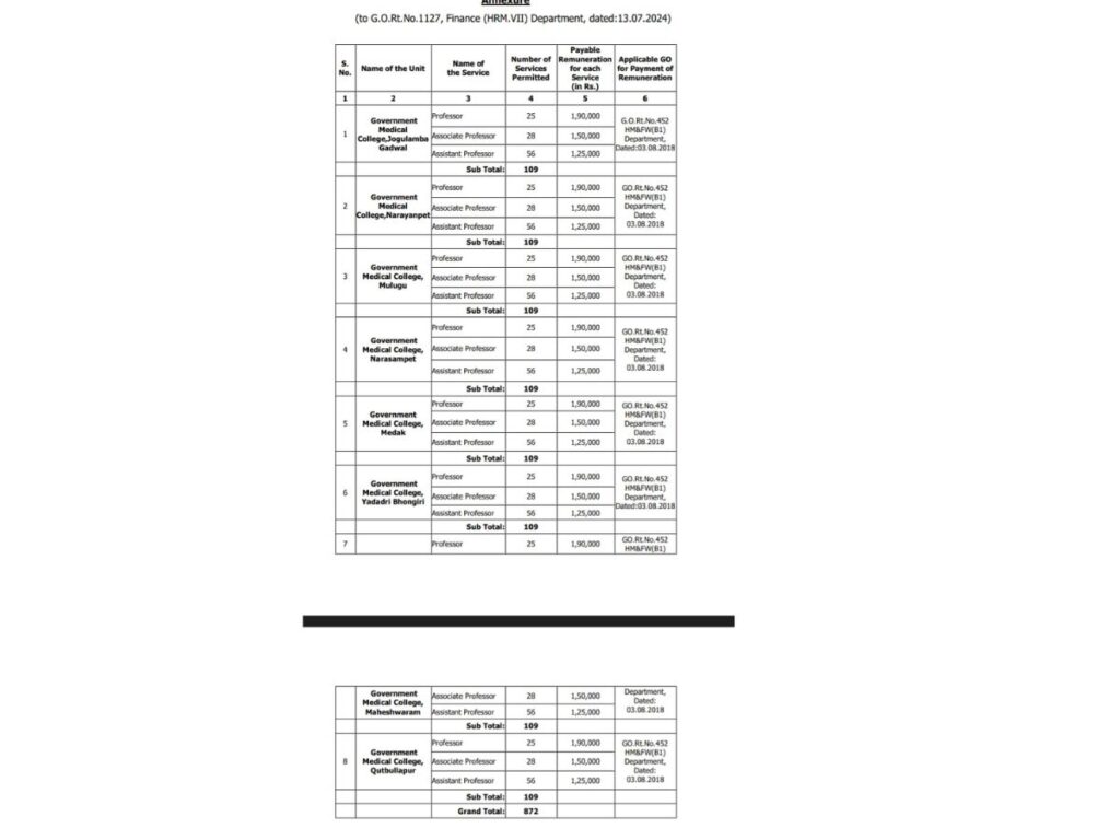 An equal number of posts (109 per district) for recruitment have been notified for each of the 8 new government medical colleges/ teaching colleges including Jogulamba-Gadwal, Narayanpet, Mulugu, Narsampet, Medak, Yadadri-Bhuvanagiri, Maheshwaram and Quthbullapur.