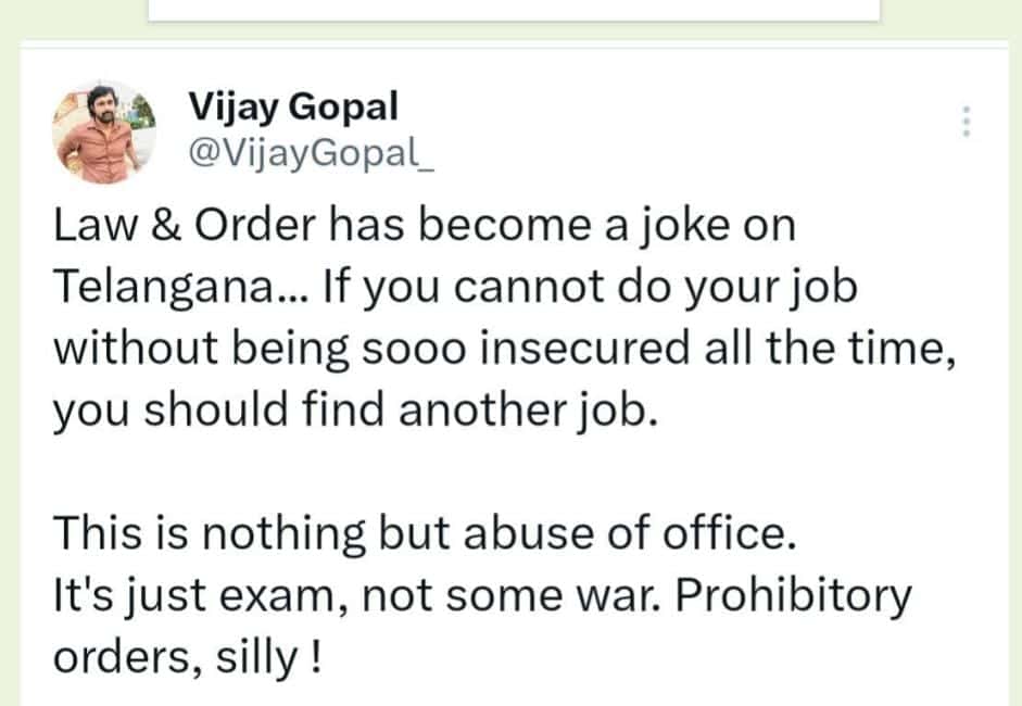“Law & Order has become a joke in Telangana… If you cannot do your job without being sooo insecured all the time, you should find another job. This is nothing but abuse of offce. lt’s just an exam, not some war. Prohibitory orders, silly (sic),” Vijay Gopal, 35, had posted on Twitter (now X) in an apparent dig at the police department after they issued a prohibitory order near examination centres.