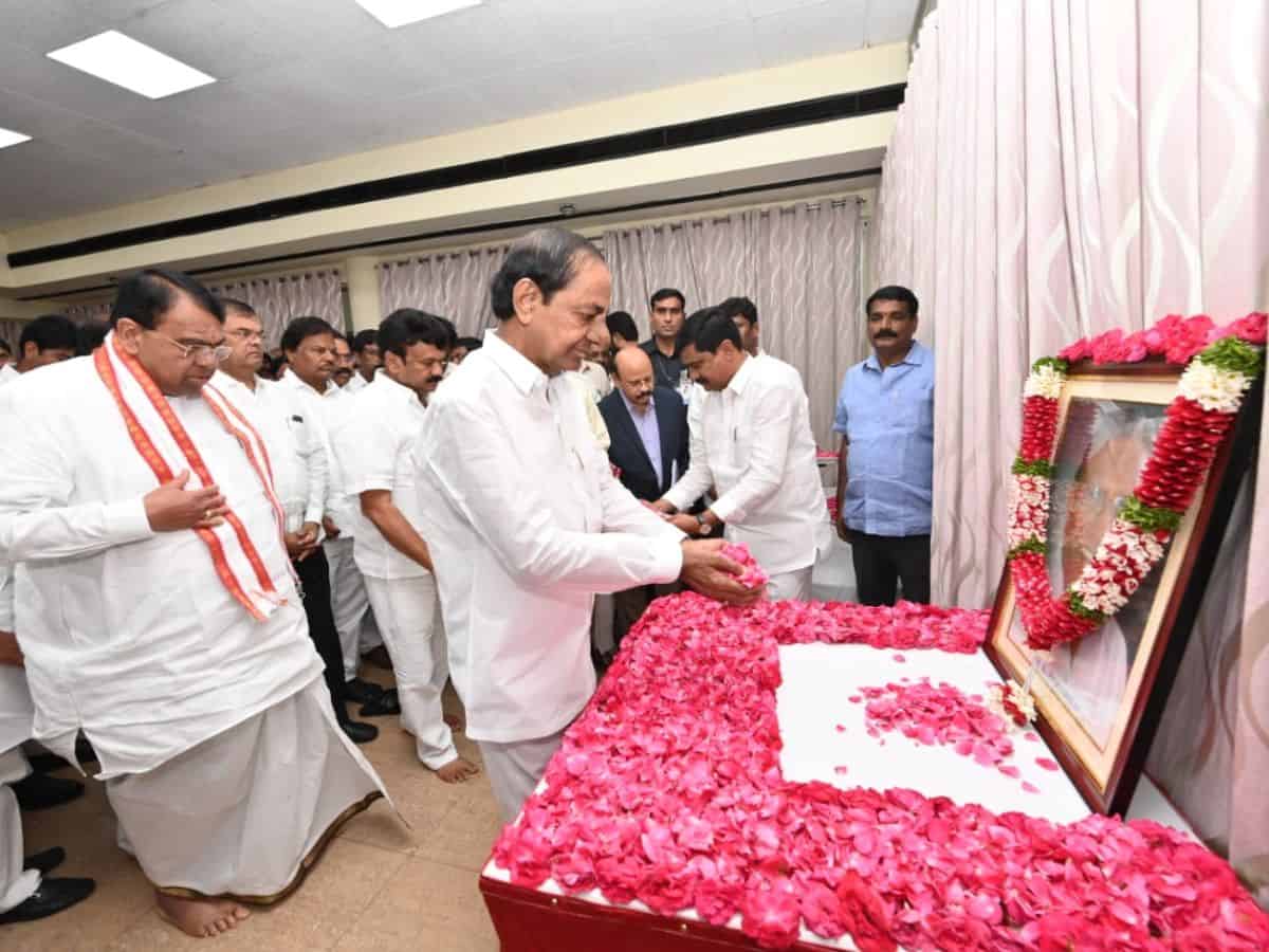 Chief Minister KCR, ministers and MLAs paid floral tributes to Jayashankar in the Assembly hall.
