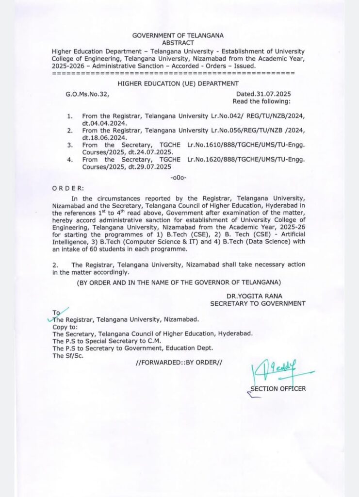 As per GO MS No 32, Telangana University has been allowed to run Bachelors in Technology (BTech) Computer Science Engineering (CSE), Computer Science Engineering- Artificial Intelligence (CSE-AI), Computer Science and Information Technology, and Data Science from the 2025-26 academic year.
