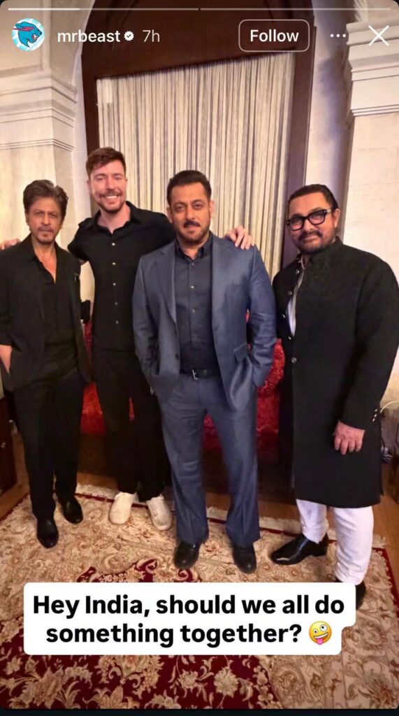 Hyderabad: It’s not every day that India’s biggest superstars Shah Rukh Khan, Salman Khan, and Aamir Khan appear together in one frame. The legendary trio, who have ruled Bollywood for more than three decades, were seen together after a long time, and this rare moment has taken the internet by storm. The reason? None other than the world’s most popular YouTuber, MrBeast (Jimmy Donaldson), who shared their picture on his Instagram Story, breaking the internet in minutes.