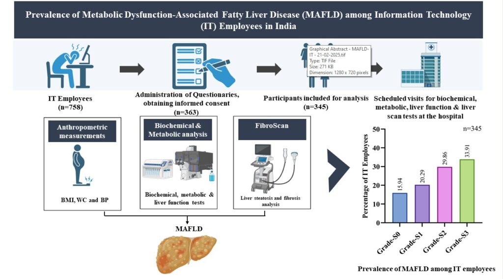 In a study conducted by university professors Dr Mahadev Kalyankar, CT Anitha, along with their research scholars Bharam Bhargava and Nanditha Pramod, in collaboration with senior hepatologist, Dr PN Rao and his team from the Asian Institute of Gastroenterology (AIG) hospital revealed that 84 percent of Indian IT employees, who were subjected to the study suffered from a fatty liver disease called Metabolic Dysfunction-Associated Fatty Liver Disease (MAFLD).