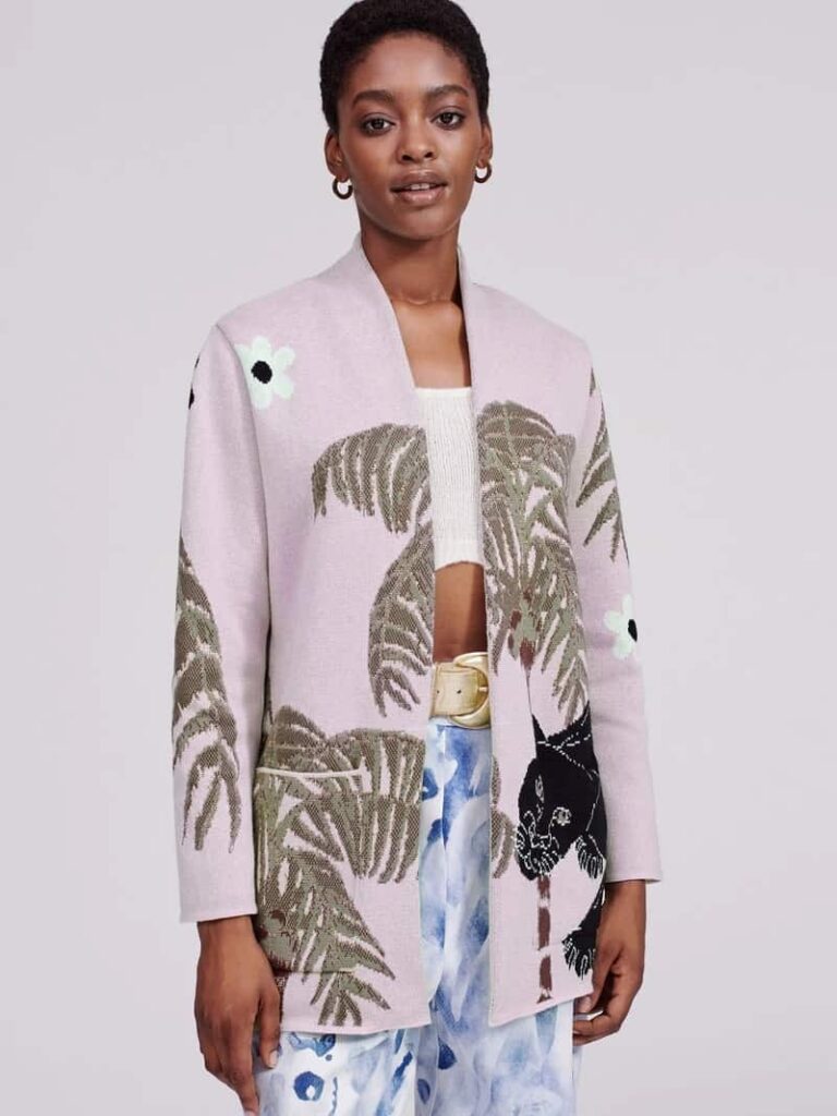 The exquisite Hayley Menzies prowling panther cotton jacquard cardigan, which retails for Rs. 42,317, was worn by Upasana, who stood out in her attire.