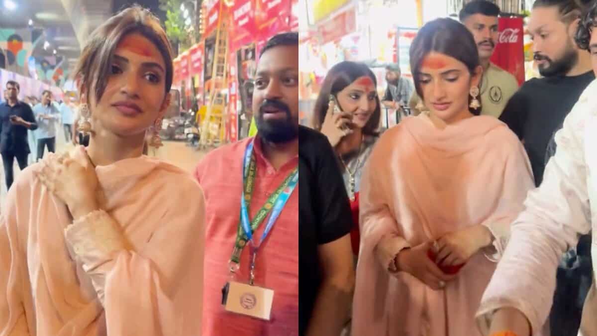 She wore a peach salwar suit with a matching dupatta, styled her hair in a ponytail, and paired the outfit with jhumka earrings. She smiled warmly at the paparazzi, posed for pictures with fans, and joined everyone in chanting “Ganpati Bappa Morya” before leaving in her car.