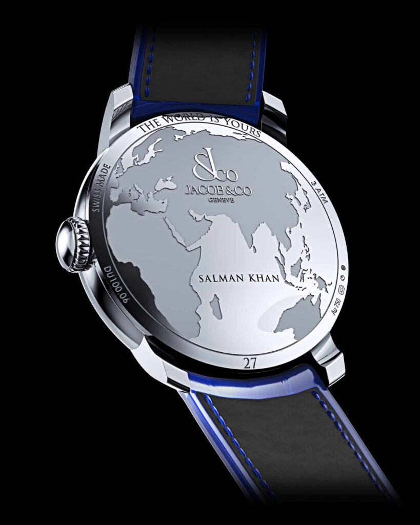 The timepiece also reflects Indian culture, with saffron and green colors from the national flag, a world map engraving, and “Salman Khan” inscribed on the back. It even includes S.K. initials on the dial and comes in a custom turquoise box, inspired by Salman’s famous bracelet.