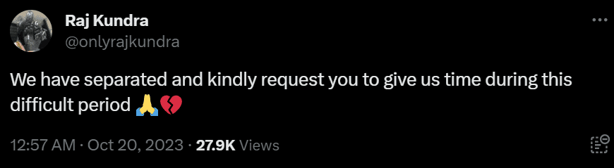 Mumbai: In a shocking move on X (formerly known as Twitter), Bollywood actress Shilpa Shetty’s husband, Raj Kundra, shared a cryptic message announcing ‘their separation’. The post, while not mentioning Shilpa by name, read, “We have separated and kindly request you to give us time during this difficult period.”
